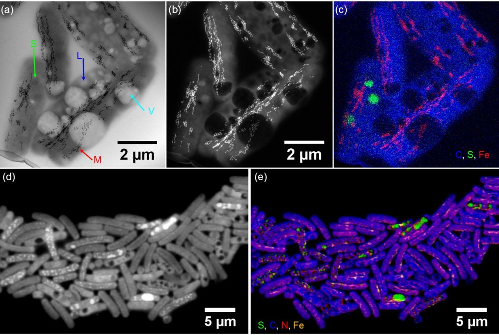 为了认识趋磁大杆菌 “趋磁性、生物矿化、生理代谢”三者之间的内在联系,中科院地质与地球物理研究所地磁场与生物圈演化学科组研究团队联合加拿大同步辐射光源实验室和澳大利亚国立大学的合作者,综合透射电子显微学、同步辐射和单细胞宏基因组学技术对发现自天津于桥水库的趋磁大杆菌进行了深入研究。结果发现: