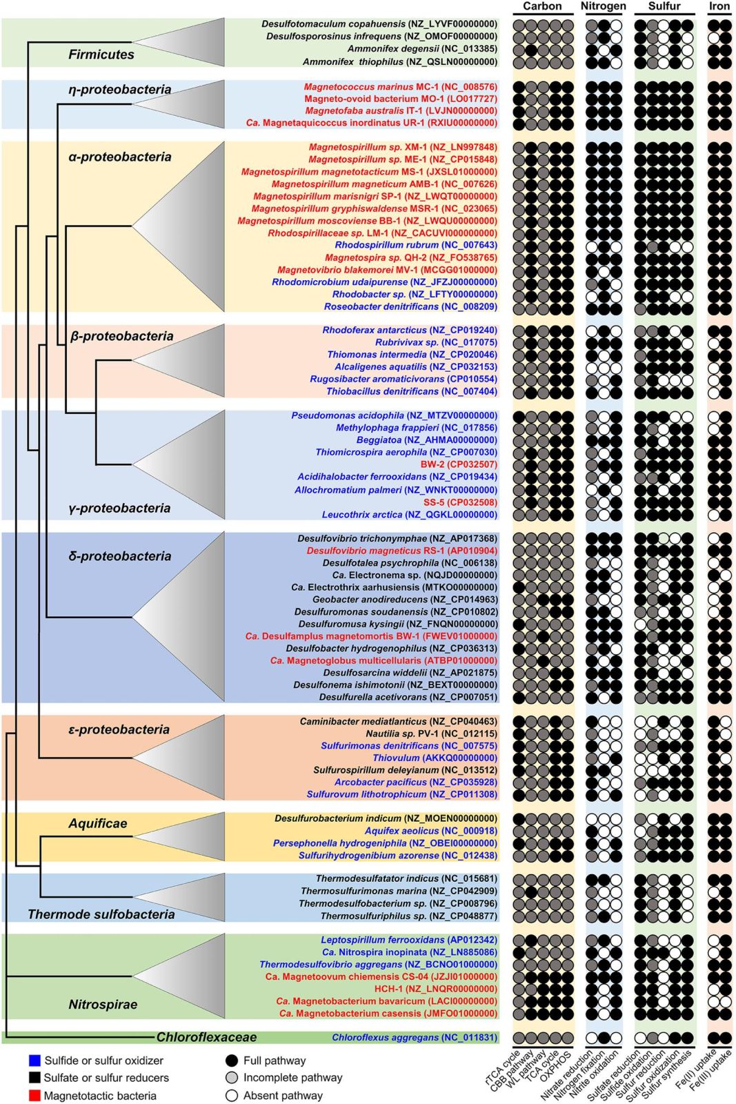 图5 基因预测分析揭示趋磁细菌具有碳、氮、硫和铁等元素多样化的代谢潜能,指示其是一类重要的微生物功能群,在地球水生环境的物质和能量循环中起重要作用