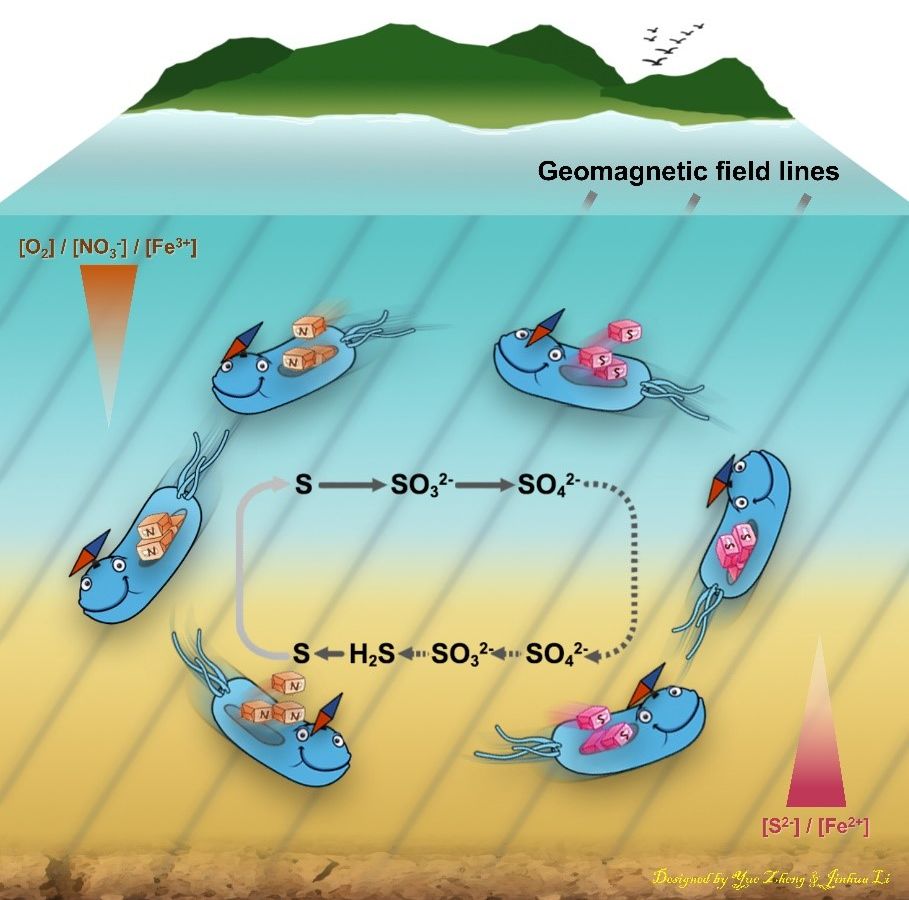 研究发现趋磁细菌可能是一类重要的微生物功能群,他们利用地磁场的定向作用,在有氧-无氧界面(OAI)中上下穿梭,从而将OAI上部有氧或微氧与其下部的厌氧环境联动起来,进而驱动碳、氮、硫和铁等在地球水生环境的无氧与有氧环境中的元素循环。